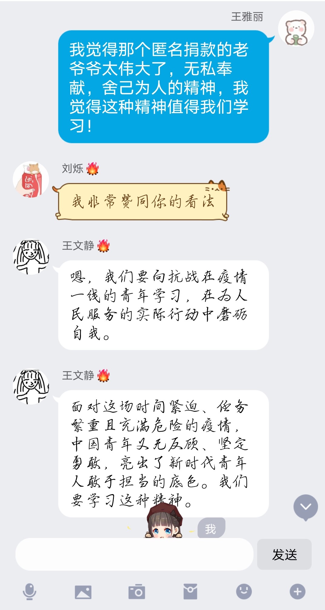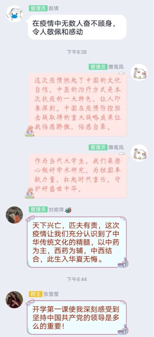 观看结束后,财税学子们纷纷通过群组讨论、撰写观后感等方式,表达了自己的观看心得。2017级财政学二班的朱英杰指出,此次的大讲堂让他明白了科学防控、坚定信心就是抗击疫情最好的疫苗。届时病毒隐匿、万物复苏,一切都将会好起来,抗疫精神也会成为中华民族伟大复兴的磅礴动力。2017级税收学四班的周琪在感想中提到,在这次的疫情保卫战中,我们虽然看到了生命的脆弱,但同时也看到了许多美好的心灵。2019级财政学一班的刘烁在班级交流中讲到,此次的疫情,既是挑战也是机遇,我们应该全面、辩证地看待国情,要积极面对,勇于接受挑战。2019级财政学五班的刘姊娴感慨说,白衣天使、解放军战士、党员等各行各业的英雄们,若有战,召必回,战必胜,他们以自己的力量为祖国构建了一层坚不可摧的屏障。病毒虽残酷,但绝不会击垮每一个人。2019级税收学一班的刘梦真深刻领悟到了当代大学生的责任与使命,她指出我们应积极参与到全民运动中去,扛起中华民族伟大复兴的旗帜,争做新时代的领路人。2019级税收学五班的刘萍则对“抗疫精神”进行了总结。在她看来“抗疫精神”有五重含义:一是万众一心、同舟共济的守望相助精神;二是闻令而动、雷厉风行的英勇战斗精神;三是顾全大局、壮士断腕的“一盘棋”精神;四是舍生忘死、逆行而上的英雄主义精神;五是充满信心、敢于胜利的积极乐观精神。