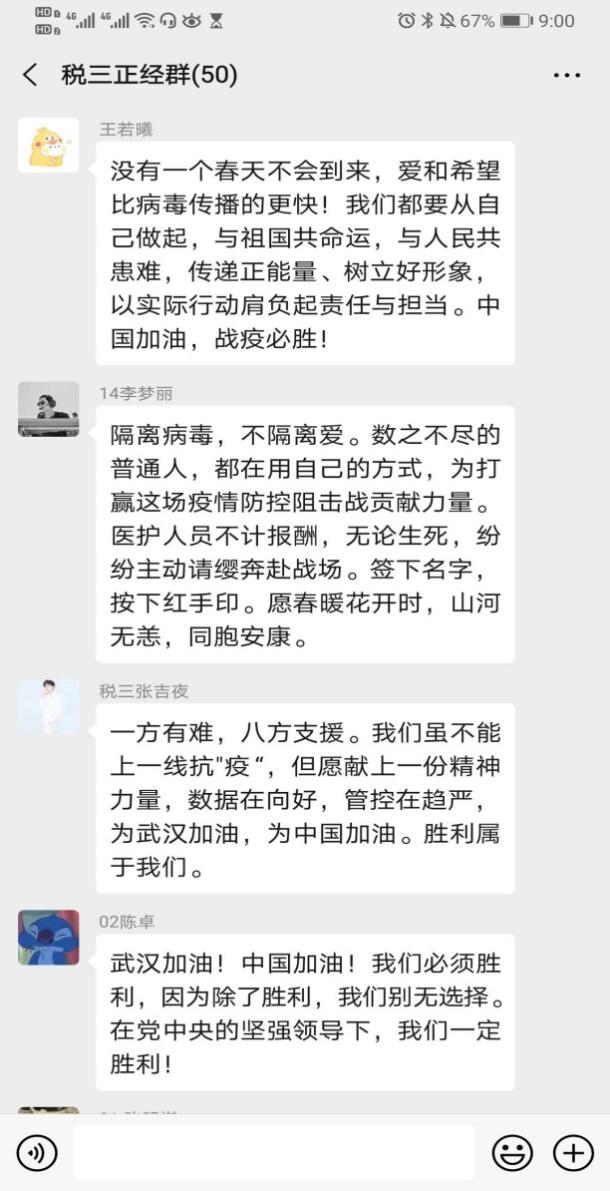有一份热,发一份光,相信财税学子们定能以本次活动为契机,勉励自己,不负韶华,心系国家命运,主动肩负起青年人的使命,让青春在时代进步中焕发出绚丽的光彩!“道路纵多荆棘,严寒难锁春风”,愿四海疫情皆终,疾患永散。(通讯员:李晓蕾 李嘉树)