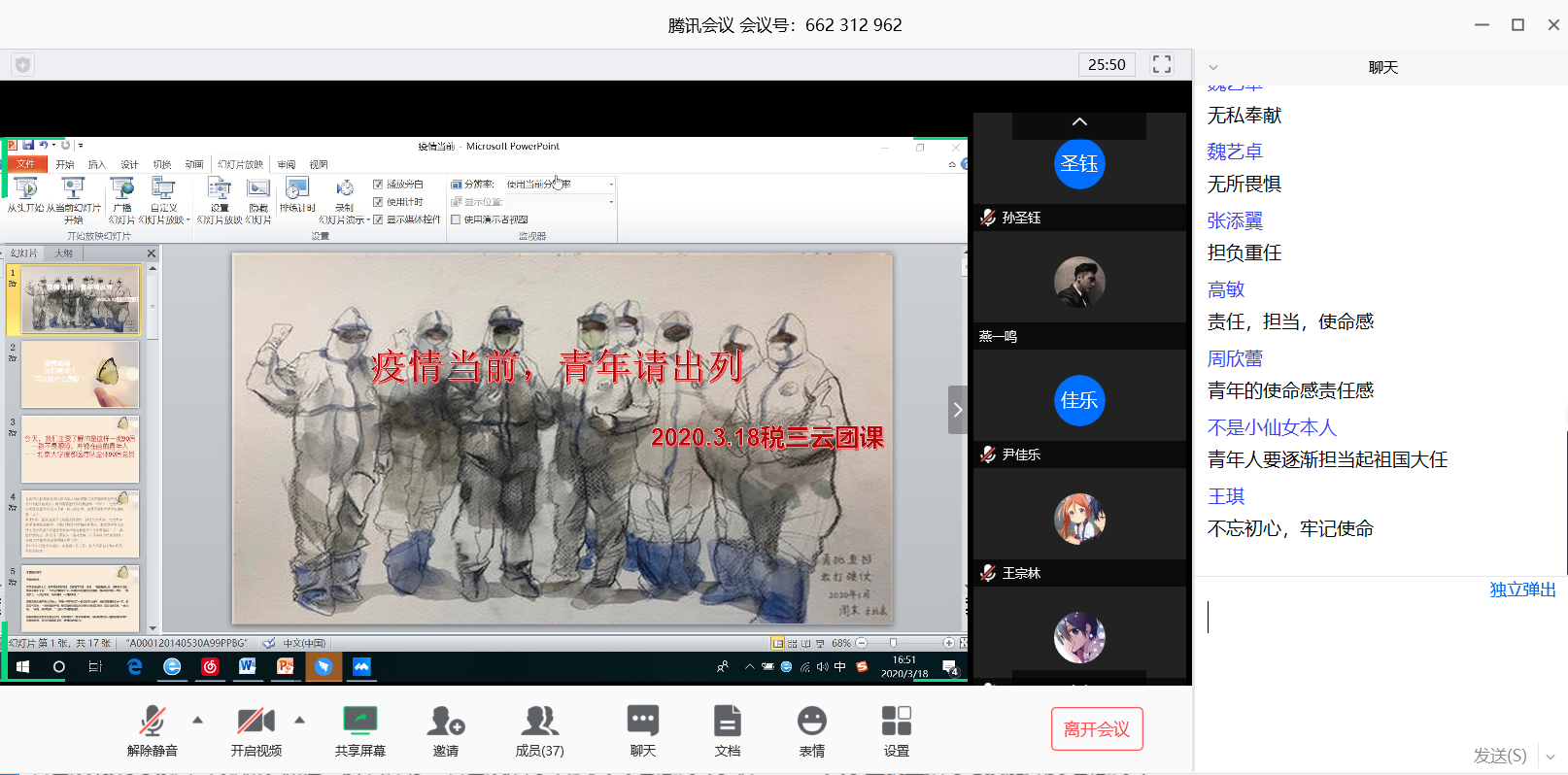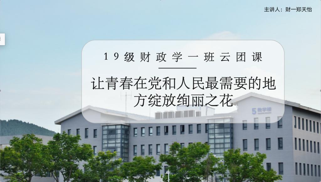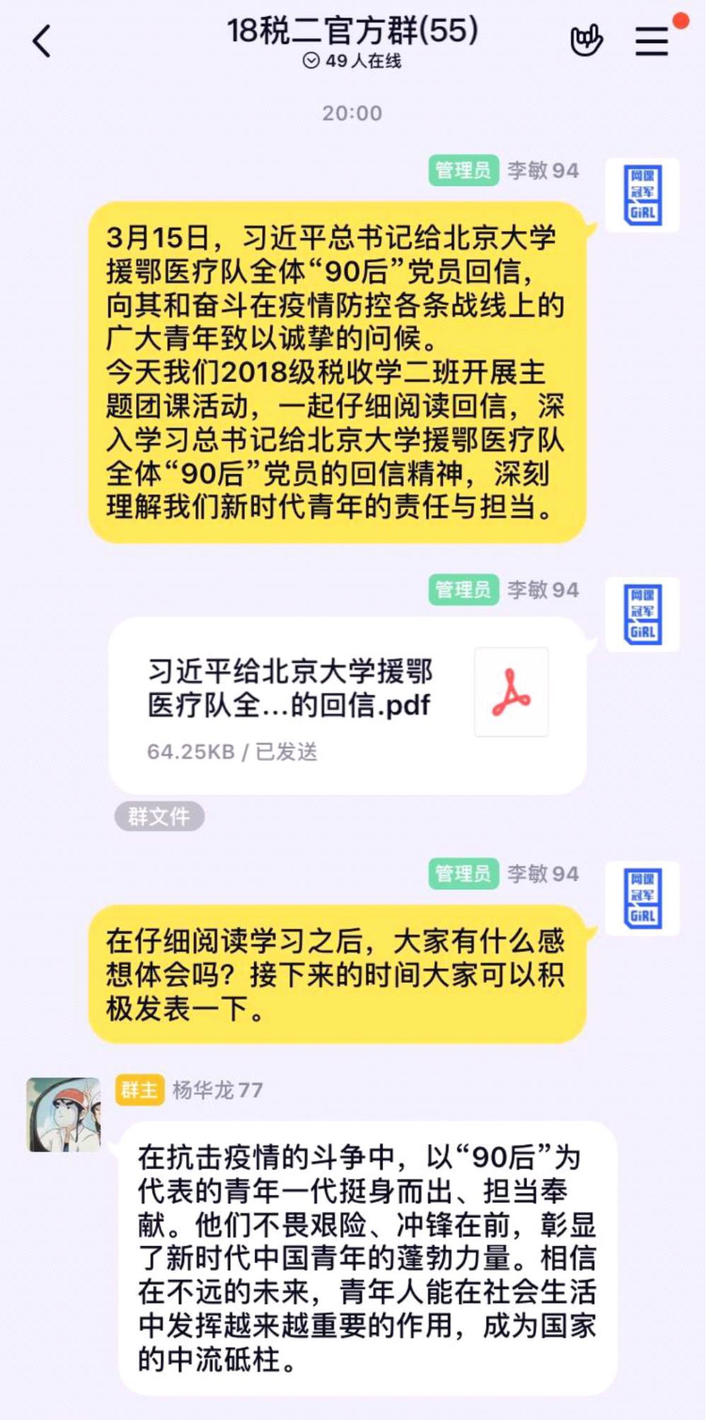 2019级税收学三班以“疫情当前,青年请出列”为主题,开展了“云团课”活动。在读完习近平总书记的回信后,同学们感触良多,围绕“疫情当前,我们青年人可以做些什么?”展开了热烈的讨论。随后,同学们观看了援鄂医疗队“90后”党员对习主席回信的感想。从他们的字里行间,同学们深切地感受到这群“90后”党员奔走“抗疫一线”的坚定决心和能为国家做贡献的自豪之情。