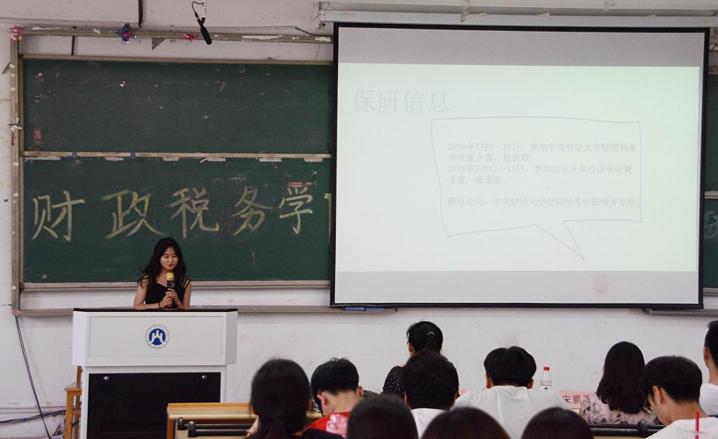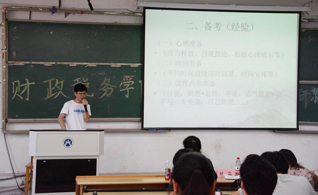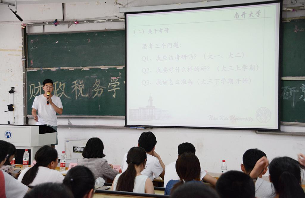 首先进行分享的学生代表是考取了南开大学的贾泽明。他认为最重要的是要先确定自己是否考研,他明确指出盲目跟风不可取,只有想明白自己想要的是什么,才会有源源不断的动力。紧接着,他指出考研目标主要由城市、学校、专业这三个要素决定。最后他结合自身经历为同学们讲述了考研的过程。