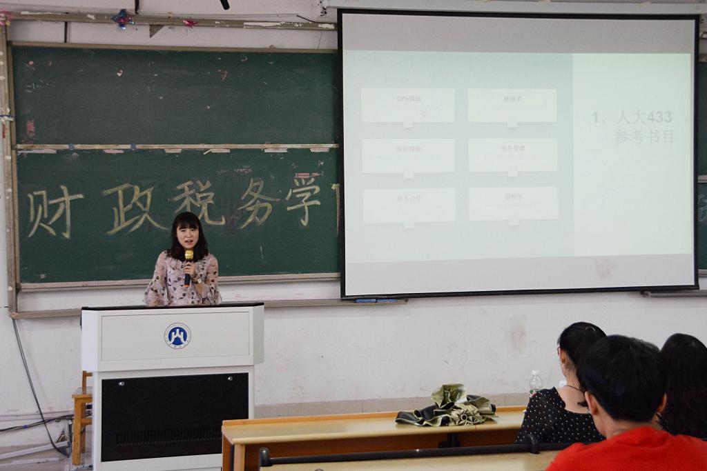 第二个进行分享的学生代表是考取了中国人民大学的宋鹏飞。她的分享分为三个方面,首先,她讲述了自己考研的初心,又从反面提出为了逃避就业而考研,盲目从众地去考研,考研时过度自大、过度自卑这几种错误的心态。接着,她介绍了人大实力及美景,又以自身为例,提醒同学们应该按照自己的情况选择适合自己的院校,要找到适合自己备考方法。最后,她提出身处大一大二的同学们应当先确定好目标,学好本科课程,找到自己的兴趣所在,并且要注意英语口语的学习。