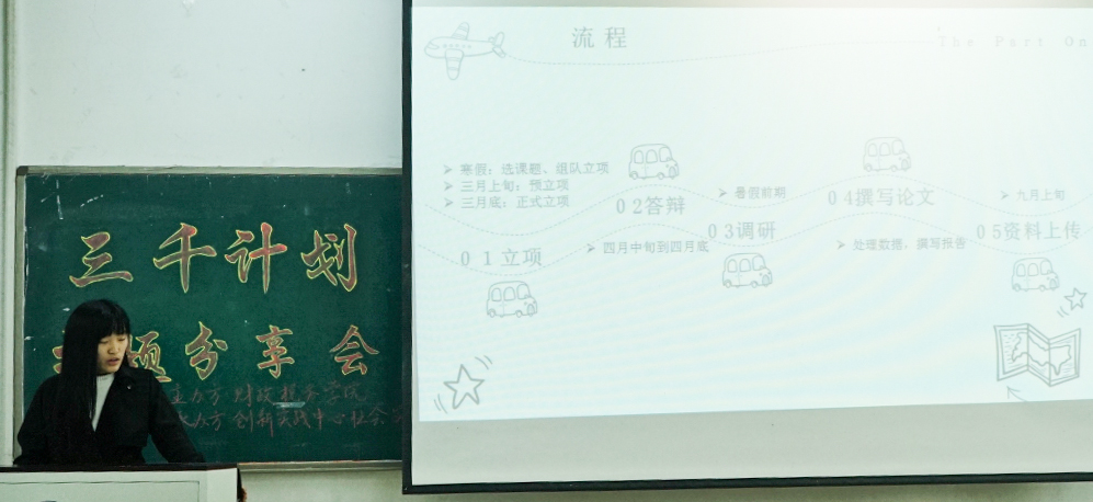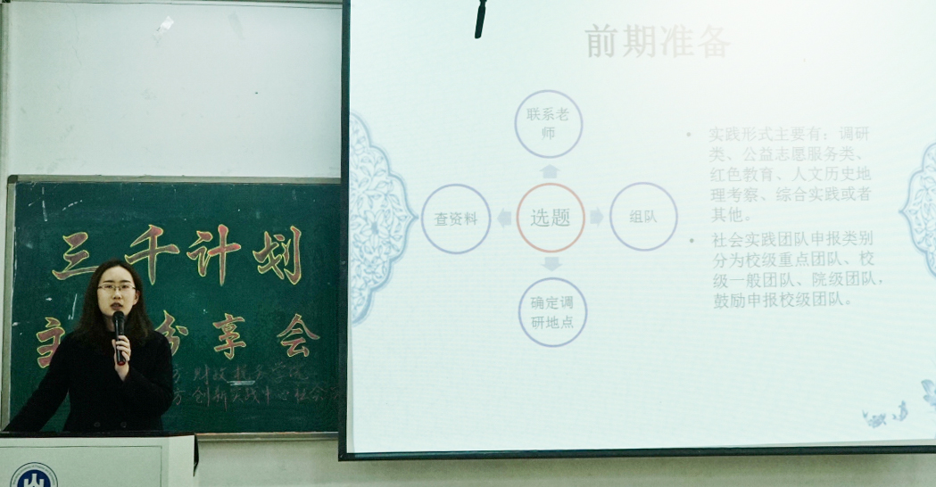 本次分享会中两位同学的精彩分享鼓励了2018级学生在学好理论知识的同时,也要积极投身到社会实践中去。期待新一级财税学子们在未来“三千计划”的实践活动中能够吸取上一级同学的经验,青出于蓝胜于蓝,再创傲人的成绩。(通讯员:邢雯静摄影:冯雨晨)