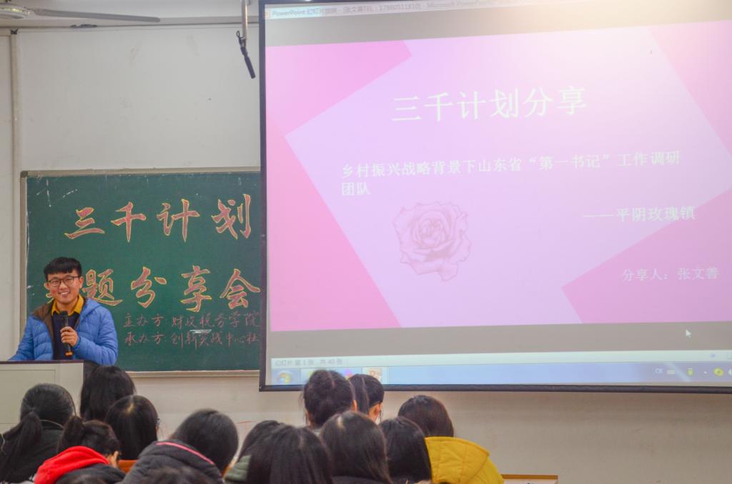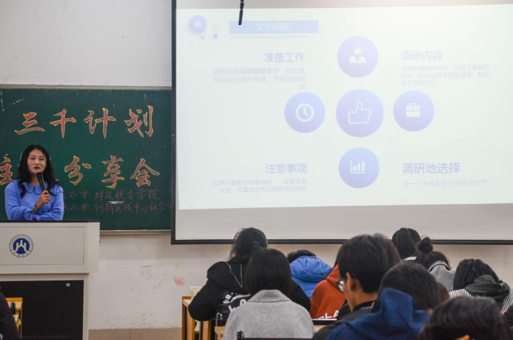 三产融合背景下农业旅游助推农村振兴的现状和发展调研团队队长李文慧进一步介绍了团队对“三千计划”社会实践的规划。她首先分享了组建团队的经验,接着介绍了团队前期准备和实地调研的情况,最后分享了撰写调研报告的体会。她希望2018级新生踊跃参与社会实践,关注社会发展,承担社会责任。