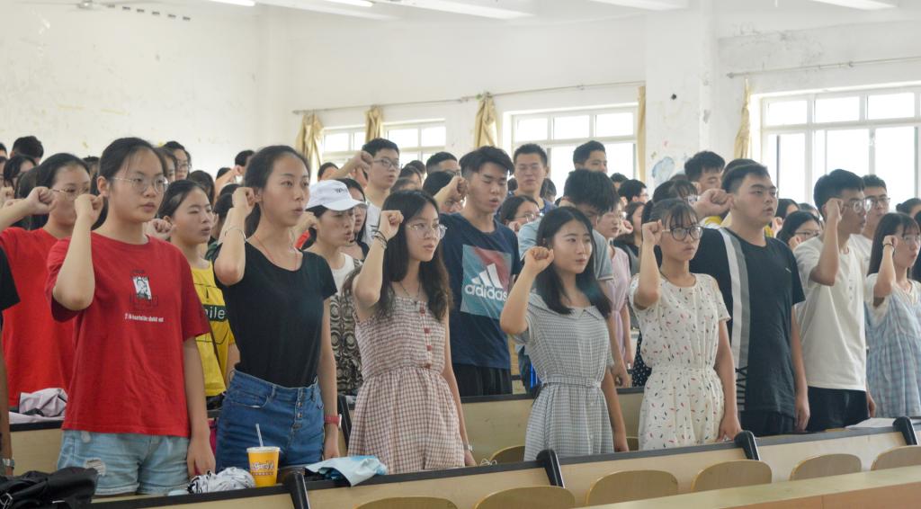 最后,各班同学在“严谨治学,诚信为人”的横幅上签名并在《诚信考试承诺书》上签名。考评委助理带领全场同学庄严宣誓。在同学们铿锵有力的宣誓声中,本次大会圆满落下帷幕。