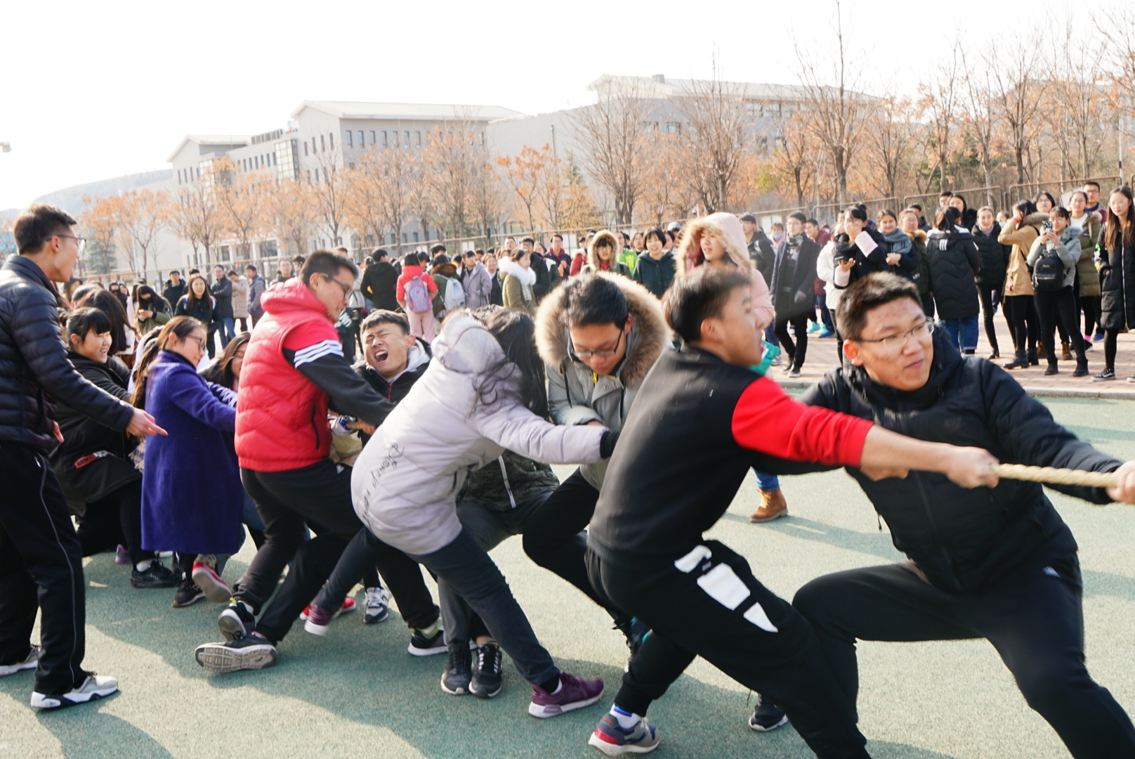 比赛首先进行预赛。冽冽寒风吹不灭同学们的满腔热情,呐喊助威声此起彼伏。振奋人心的呼喊回荡在操场上空,瞬间点燃了财税学子的激情。参赛队员们斗志满满,一双双手紧握麻绳。经过激烈的比拼,税收学一班顺利拿到半决赛的第一张入场券,紧随其后进入半决赛的分别是税收学五班、财政学四班和财政学一班。