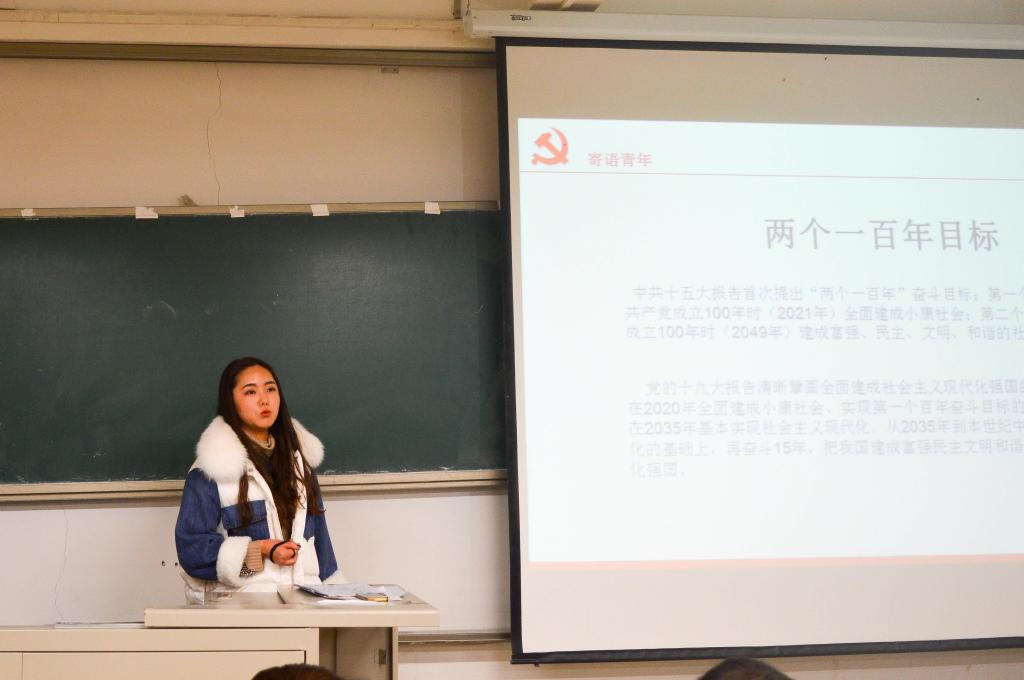 2015级财政学二班团支书马爱茵对十九大精神做出解读,她认为同学们要学懂、弄通、做实十九大精神。当代青年正处在中国最好的时期,青年命运与国家命运紧密相连。认真研习党的十九大精神,为建设富强民主文明和谐美丽的社会主义现代化国家添砖加瓦,是当代青年义不容辞的责任。她寄语青年:调整自己,准确定位,选对时机,明确目标。愿同学们勇做时代先锋,为祖国贡献自己的青春力量。