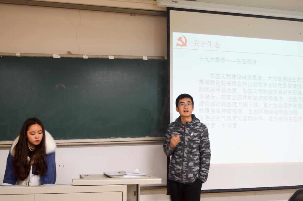 本次“学习十九大,学生在行动”主题宣讲会共分两场。在财政学专场,2015级财政学一班班长施展首先介绍本场宣讲会主题“学习十九大,学生在行动”。他简要分享了十九大报告的主要内容,强调同学们要牢记十九大主题:不忘初心,牢记使命,为实现中华民族伟大复兴的中国梦不懈奋斗。随后,他对十九大报告第十三部分中的生态问题进行详细解读,他认为生态文明是千年大计,推进绿色发展是把中国建设成美丽强国的必修课。他由环境生态的修复问题引发出对班级生态的思考,他指出一个班级的建设同样受各种因素影响,只有同学们力求卓越,班级建设才会欣欣向荣。