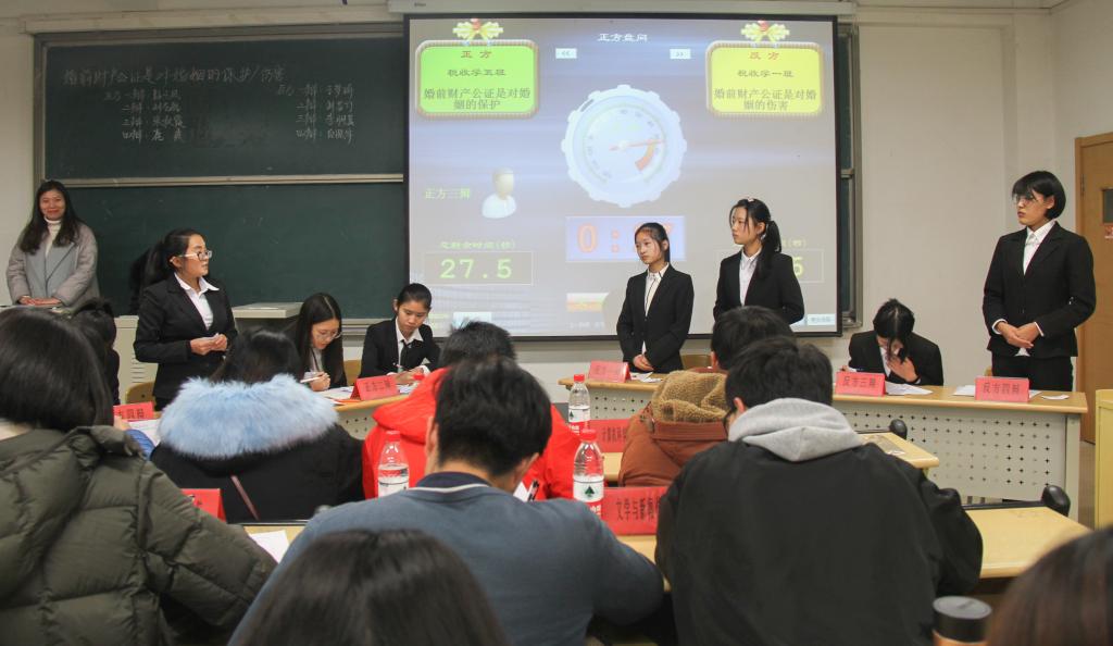 本次辩论比赛的辩题为“婚前财产公证是对婚姻的保护/伤害”。正方辩手认为婚前财产公证是对婚姻的保护,反方辩手持相反观点。双方队员进行自我介绍后,比赛正式开始。