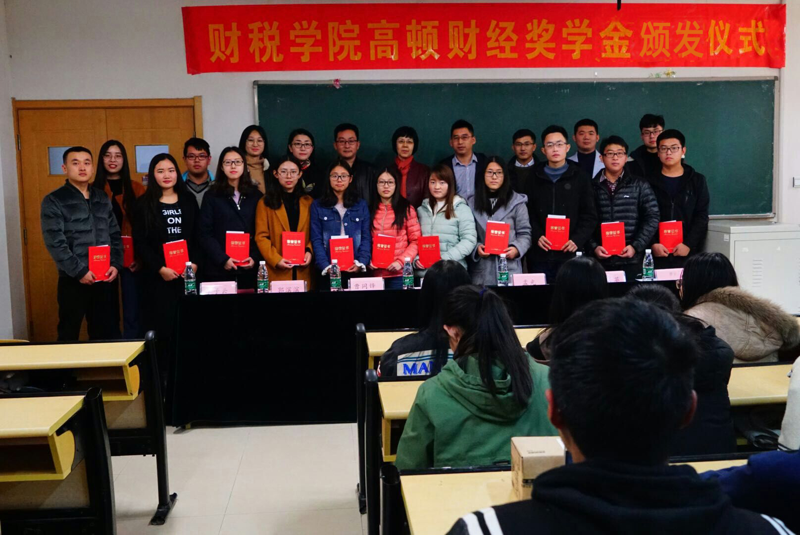 颁奖仪式进行第二项,由郭滨滨老师公布获奖名单。获得高顿财经一等奖学金的学生有:张萍、张清莹、刘圣源、彭玉琢、陈兆鹏;获得高顿财经二等奖学金的学生有:高爽、周慧敏、徐金诚、麻超、赵紫名、张玉、陈喆弟、张明苗、余夕夕、王小慧。获奖学生依次上台领奖并合影留念。