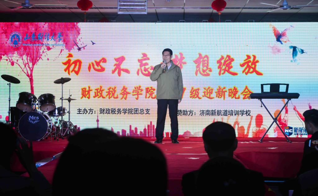 炫酷的屏幕,耀眼的灯光,流光溢彩,华灯闪烁。晚会开始前,李玉成书记上台致辞。他首先对晚会的主题进行阐释,简要总结了党的十八大以来所取得的的重大成果与党的十九大确立的习近平新时代中国特色社会主义思想。他强调,青年是强国建设的根本,希冀财税学子秉持理想信念,不忘初心,成为建设新时代的栋梁之才。李书记预祝晚会圆满成功。