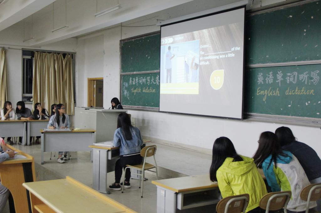 本次大赛大一由相邻班级组成五人队伍参赛,大二组成大二财三四队、大二联队参与比赛,共分为三轮进行。第一轮为听写题,即根据播放的音频默写单词;第二轮为图片题,即根据题目完成与图片相关的语句填空;第三轮为视频题,即根据视频内容完成与视频中某个片段的完形填空。