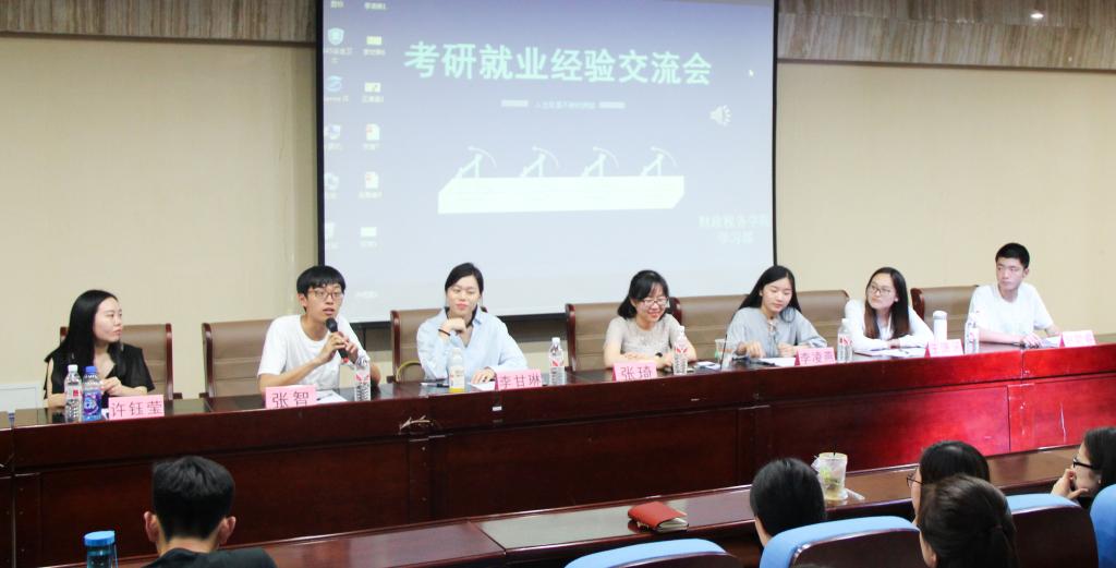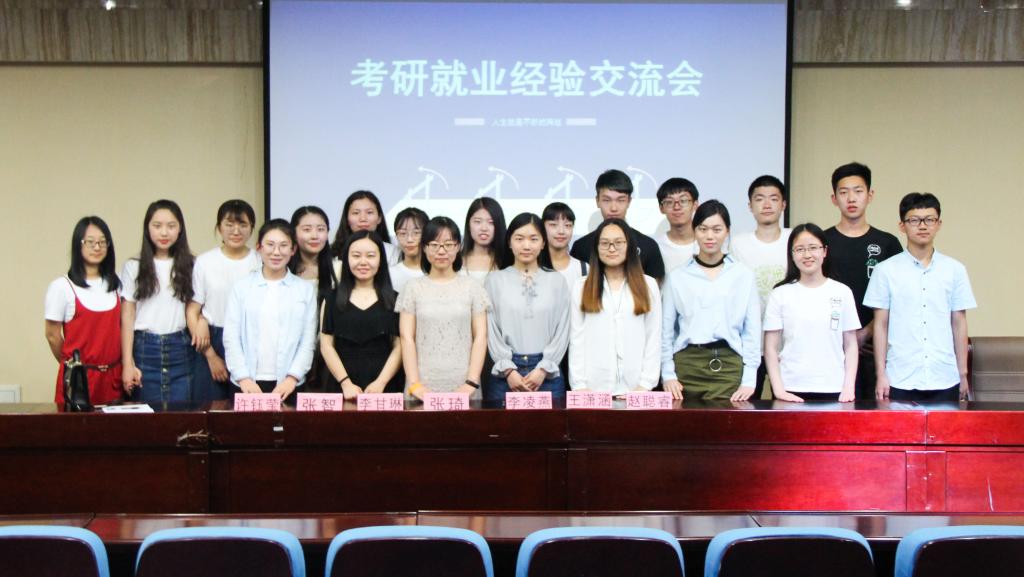 主办,学生会学习部承办。在研究生入学考试中取得优异成绩和在就业竞争中脱颖而出的2013级学生张智、赵聪睿、王潇涵、李凌燕、许钰莹、张琦、李甘琳受邀参加本次交流会,向同学们分享宝贵的考研就业经验。2015、2016级部分同学聆听了此次经验交流会。