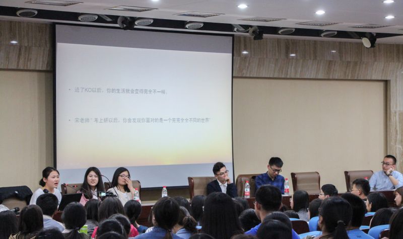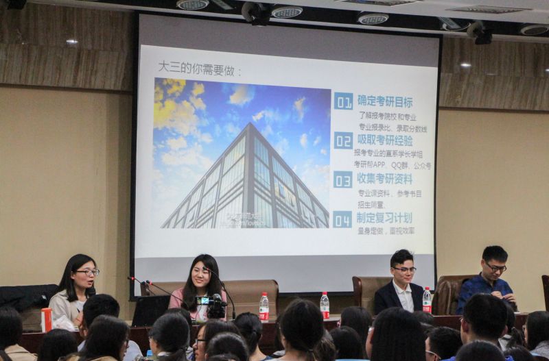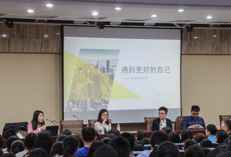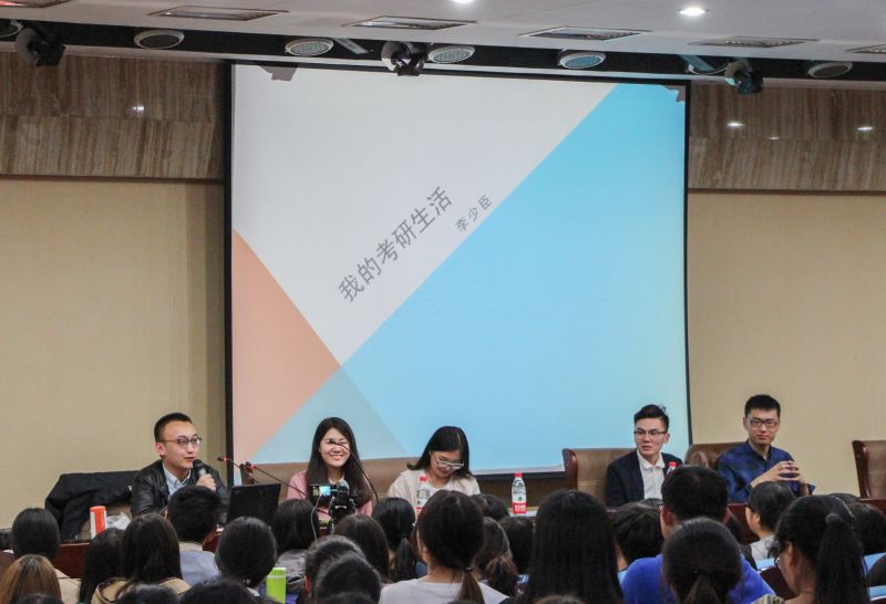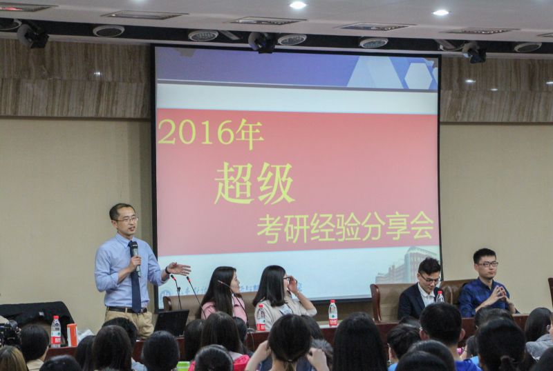 副教授宋浩主持,由在2016年研究生入学考试中取得优异成绩的刘维特、罗昶、王琳、李少臣、董文丽和杜振香与同学们分享考研经验。