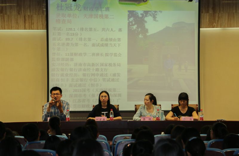 在舜耕校区国家公务员及研究生考试经验交流会上,五位优秀毕业生向大三学子分享了国考及考研的经验与技巧。成功考取天津国税第二稽查局的杜冠龙提出“国考易,考研难”,“国考优于省考”的观点,并重点讲解如何选择自己的岗位。“越磨砺,越光芒;越努力,越幸运”是王小雨的座右铭,她努力拼搏,不断进取,最终成功考取日照市国税局。入职东营市高新区国税局的徐成根据自身经历向大家详细介绍国考各个环节的注意事项,并推荐优秀的国考参考资料。“明确目标,踏实肯干,摆正心态”是秦悦成功考取财政部财政科学研究所的方法。成功考取南开大学城市经济学专业研究生的张欣告诫大家,考研是个艰苦又漫长的过程,只有“坚持自我,充满自信,精神饱满,目标明确”才能取得成功。在最后的问答环节,五位主讲人就大三学子提出的问题做出一一解答。