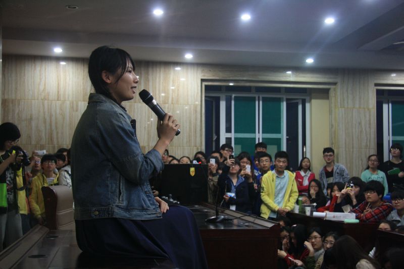 李老师介绍了嘉倩的简历。荷兰任职华人报社记者,巴塞罗那任职媒体咨询,英国外交部任职新闻官员,辞职成为专业作家到全国各地进行“交换梦想”活动的经历让在场的学生叹为观止。李老师祝愿嘉倩的到来可以“用梦想点亮山财大”。