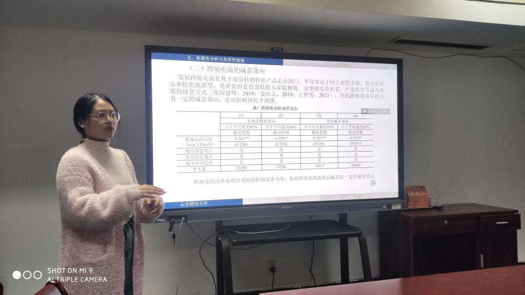 816会议室举行了本学年第8期工作论文研讨会,宋颜群副教授汇报了她的工作论文《跨境电商改革可以提高居民幸福感吗?》。