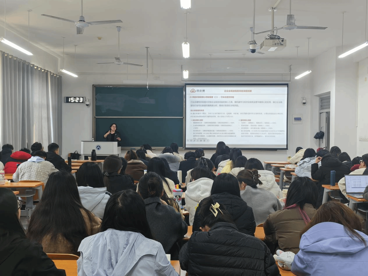 “税务实务前沿讲座”2026年第1期在圣井校区7号教学楼顺利举办。百企慧科创教育商学院专家、财税规划实战专家、中国注册会计师、税务师、省科技厅专家库成员黄当杰女士应邀作了题为“大数据与AI下企业税务风险管控”的报告。副院长赵宝廷主持了讲座,2025级税务专业硕士研究生参加了本次讲座。