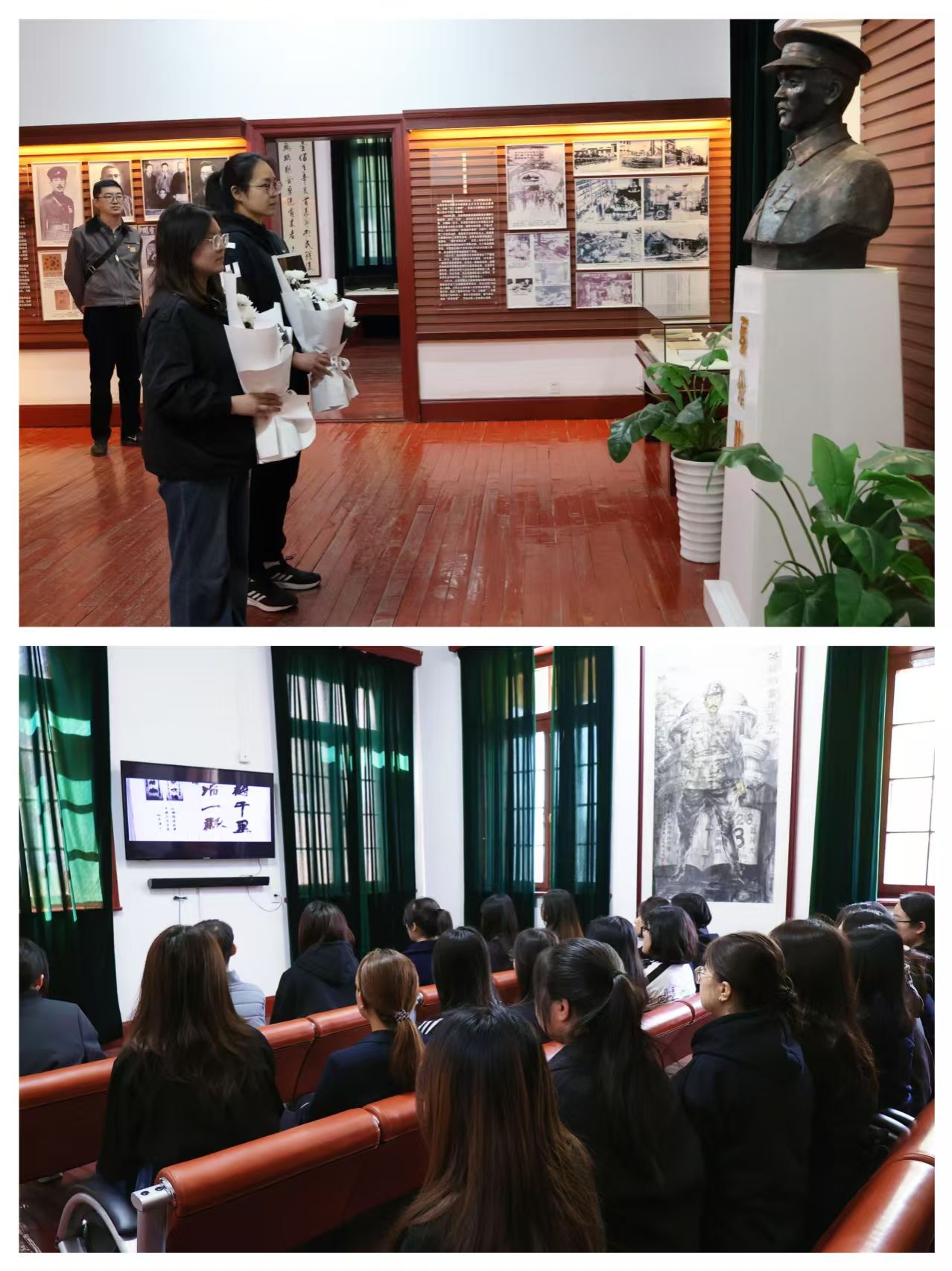 参观结束后,全体学子肃坐观看蔡公时先生事迹影像,在光影中追思先烈忠魂,感悟革命先辈坚守信仰、宁死不屈的崇高精神。随后,学生代表向蔡公时先生雕像敬献鲜花,以最诚挚的方式向革命先烈致以崇高敬意。