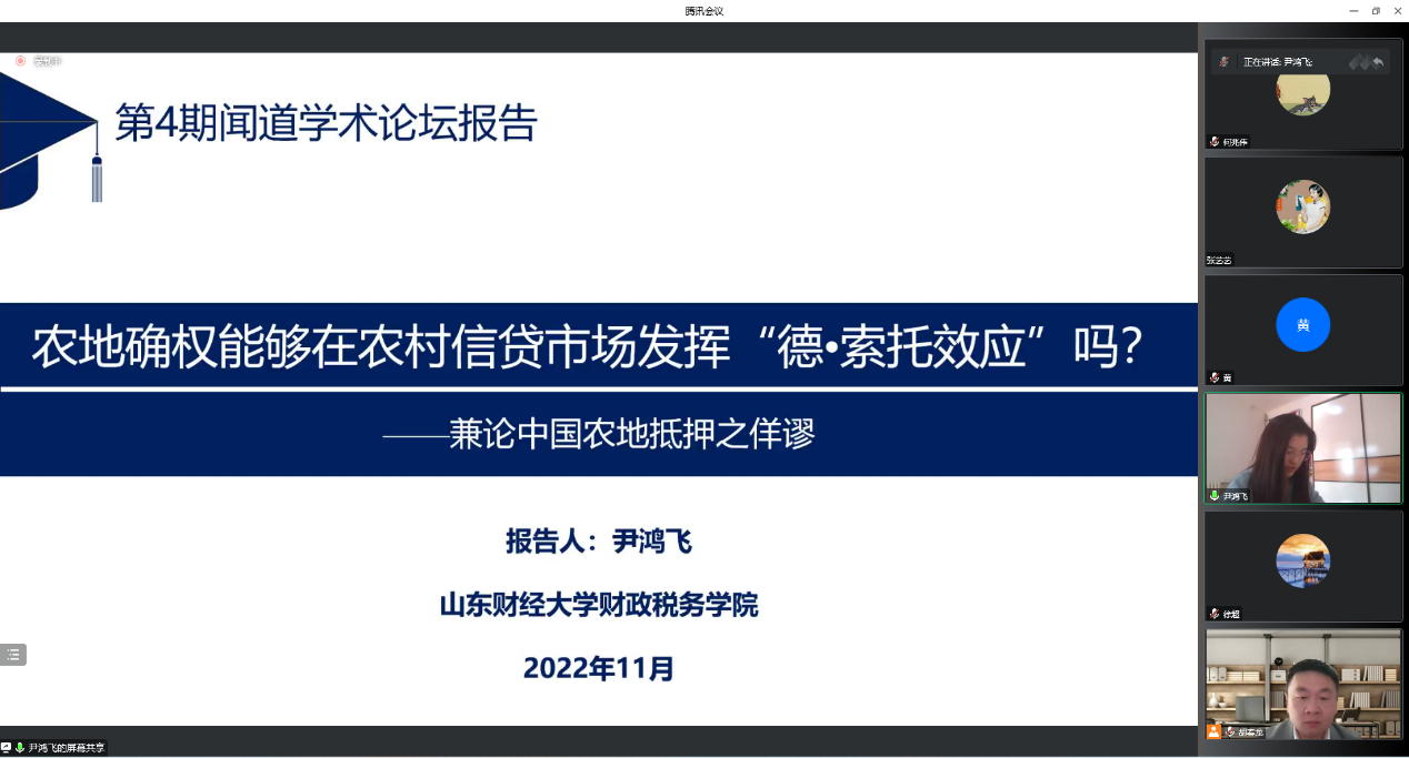 2022年第4期闻道学术论坛以线上方式举行。本期论坛由青年博士尹鸿飞做了题为《农地确权能够在农村信贷市场发挥“德•索托效应”吗?——兼论中国农地抵押之佯谬》的学术报告,研讨会由青年博士胡春龙主持,中文a片