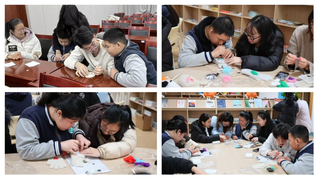 参观结束后,一组志愿者与孤独症儿童携手进行“毛线缠缠乐”创意手工制作,另一组则与听障儿童共同开展爱心手套DIY活动。过程中,志愿者们耐心引导、温暖陪伴,与孩子们在协作中完成一件件充满童真与爱意的作品。这既有效锻炼了孩子们的动手能力与艺术表达,更在亲密互动中搭建起心灵沟通的桥梁,实现了情感共鸣与双向成长。
