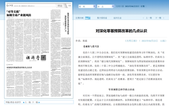 中文a片郭磊教授在《光明日报》理论版(2025-04-22)发表题为《对深化零基预算改革的几点认识》的文章。《光明日报》系中央“三报一刊”,该文章属我校A2类权威成果,并被学习强国平台全文转载。