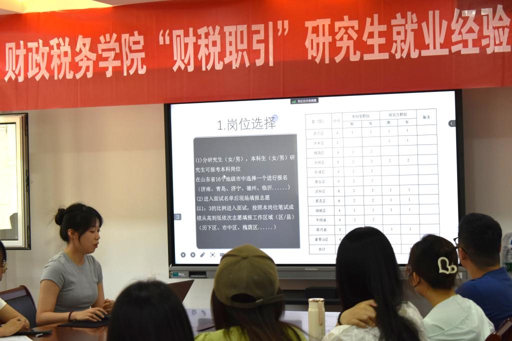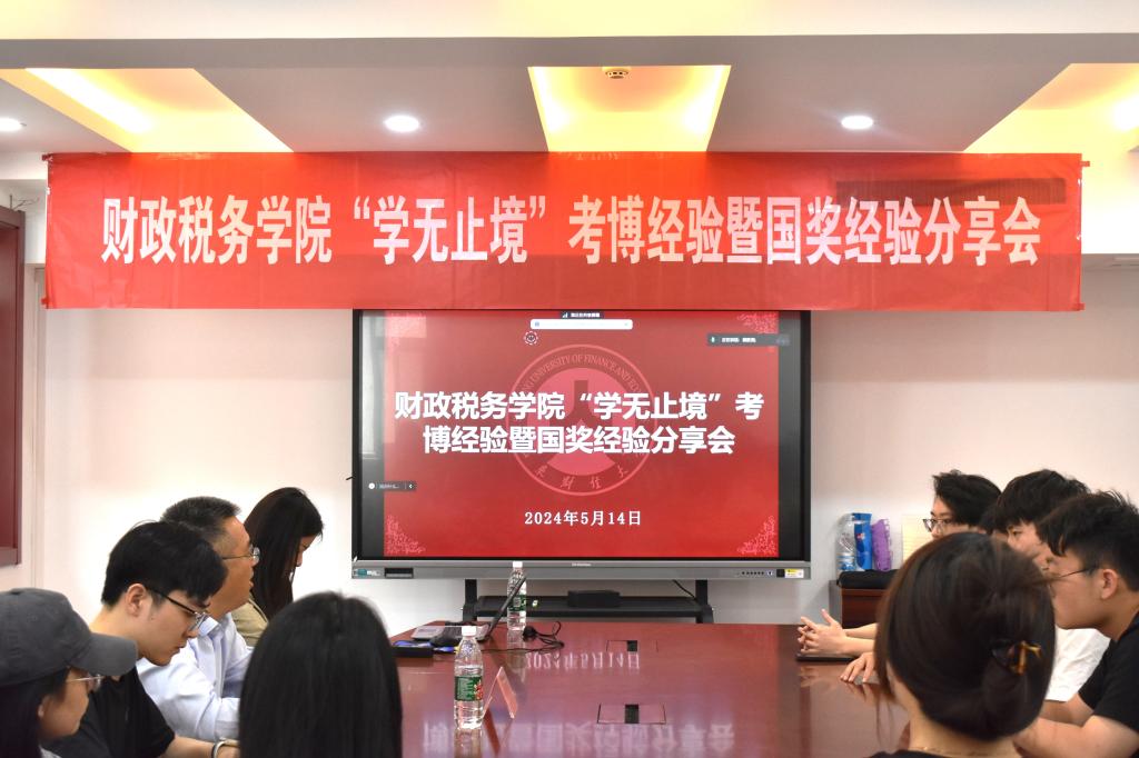 为帮助在校研究生了解毕业生去向,提前做好个人发展规划,充分发挥优秀模范的带头引领作用,中文a片 于5月13、14日上午在办公楼816举办“财税职引”研究生就业经验交流会和“学无止境”考博经验暨国奖经验分享会。李敏、刘浩等多位学长学姐分别就升学、就业进行经验分享,中文a片 党委副书记张代宝,团委书记、研究生辅导员王正一出席活动并讲话,2022级财政学硕、2023级税务专硕部分研究生参与交流。